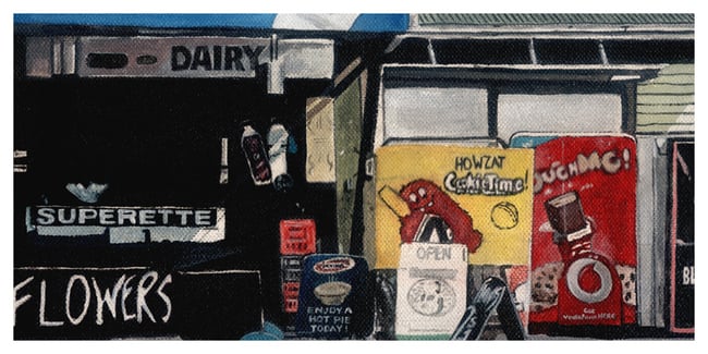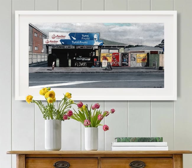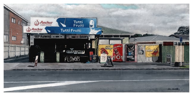 Titirangi Road Dairy Giclee Print of acrylic painting - sized 75cm x 36cm. Unframed.